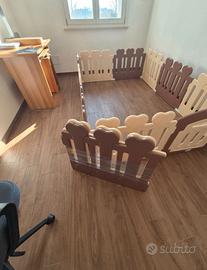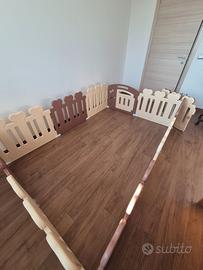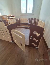Il recinto è componibile a piacere con 12 pannelli avente dimensioni in larghezza 78 cm per altezza 60 cm ciascuno, di cui uno con porticina apribile con chiusura di sicurezza.