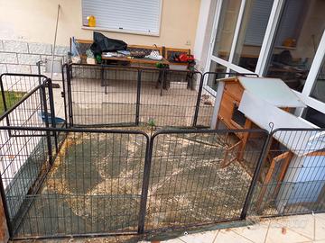 Vendo recinto, io l'ho utilizzato per i conigli ma e' molto pratico anche per cani o altri animali. E' diviso in 8 pannelli in ferro 80L x 60l x 60H cm collegati da barre di metallo, e' facile da installare e gli potete dare la forma che preferite. Per chi fosse interessato vendo anche la casetta per conigli che vedete in foto. Recinto e casetta a 100 euro.