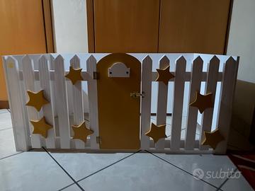 Presenta dettagli con stelle gialle in legno e una porticina apribile e chiudibile.