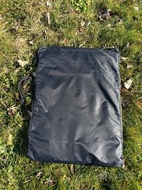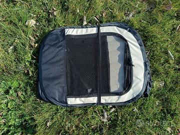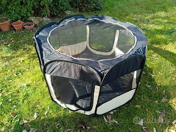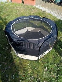 Recinto per cuccioli realizzato in tessuto oxford resistente ai graffi e adatto per esterno. Varie aperture con cerniera. 4 picchetti in dotazione. Misure: diametro 110 cm, altezza 64 cm. Ripiegato e messo nella sua busta misura 64x46. Usato poco.
