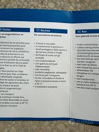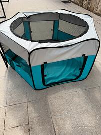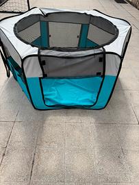 Recinto per piccoli animali o cuccioli, pratico e resistente, adatto sia per interni che per esterni. Realizzato in poliestere con rivestimento in gomma, fondo fissabile al suolo tramite occhielli e tetto in rete rimovibile per evitare fughe. Lavabile a mano a 30°. Colore turchese/grigio – 150 × 65 cm.