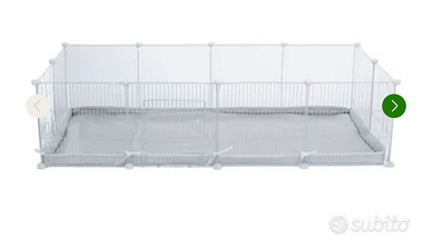 Vendo recinto per roditori,il kit comprende 1 porta di metallo,5 griglie di metallo,6 elementi di plastica con struttura in metallo.24 connettori di plastica.misure