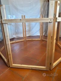 Recinzione componibile in legno e policarbonato trasparente composta da 8 pannelli delle dimensioni di cm 64x57x3 ognuno. Il recinto è molto utile per mantenere i cuccioli in uno spazio limitato all’interno di una stanza. Tutti i pannelli sono in ottime condizioni, solo 2 lastre di policarbonato presentano piccole crepe. Non spedisco, ritiro in loco.
