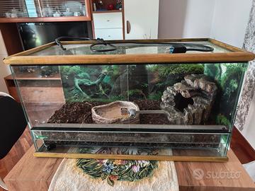 Rettilario con serratura, abbeveratoio, termometro, tana e chiavi. Misure vetrina: lunghezza 70 cm, larghezza 34 cm, altezza 38 cm.