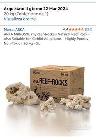 vendo per dismissione acquario,60 kg rocce reef rocks, utilizzate da un anno circa, tutte insieme, non divido. Ancora in acquario. pagate 210€ circa come si vede dalle foto. ritiro a mano