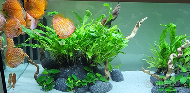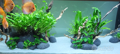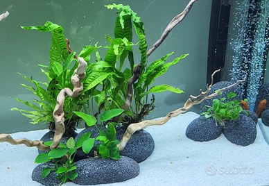 Vendo per passaggio a Marino queste splendide pietre da acquario, abbastanza rare e molto costose. La roccia Black Sky Rock ha un aspetto sferico tipo ciottolo e con un colore scuro che varia in diverse sfumature di grigio al nero. Non altera assolutamente i valori dell'acqua essendo una roccia inerte, quindi tranquillamente utilizzabile in acquari con valori acidi e teneri (io per esempio ne ho utilizzate solo alcune con i Discus, potete vedere l'effetto in acquario nelle foto su sabbia bianca). Il set che ho a disposizione è composto dalle seguenti misure/numero: