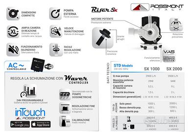 Il modello dello schiumatoio di proteine della Rossmont Skimer SX 1000 ha una portata d'acqua di 2.900 l/h (massima portata) con un consumo di soli 29 watt/h e una camera di contatto acqua/aria di 5,5 litri