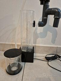 Come da titolo vendo per inutilizzo dopo dismissione acquario, skimmer Elos PS200 per acquari fino a 350 litri condizioni perfette (a parte un pezzo del coperchio del bicchiere incollato perché si è rotto ma non influisce in alcun modo sul funzionamento) ideale per acquario marino di barriera molto popolato Elos. Il nuovo PowerSkimmer 200 (abbreviato PS200) è simile al vecchio NS100 sia nelle dimensioni che nell'aspetto, ma è molto diverso funzionalmente. Invece di essere uno skimmer in stile downdraft che aspira aria in un flusso d'acqua prima di entrare nel corpo dello skimmer, il PS200 è dotato di una pompa a rulli che taglia attivamente l'aria e l'acqua in un bel mix schiumoso di bolle. Lo skimmer è alimentato da una pompa Sicce Syncra Silent, che si trova sotto lo skimmer per conferirgli un ingombro minimo di soli 48cm h x 10 diametro (tubo del corpo centrale). Oltre alla pompa a ruota ad aghi, il PS200 ha anche un paio di altre caratteristiche che la distinguono dal NS100. Queste includono una piastra di diffusione delle bolle, un silenziatore dell'aria per mantenere la pompa in funzione silenziosamente e un tubo montante più elaborato attraverso il quale l'acqua esce dallo skimmer. Io ho aggiunto una ulteriore curva in pvc sullo scarico per adattarlo alla sump ma si può togliere senza problemi.
