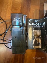 Prodotto: Haquoss Nanoskim Consumo 3,5w Portata 300LT/H per vasche fino a 120 Litri Informazioni Generali: NANOSKIM è un prodotto destinato all'utilizzo in acquari marini e nanoreef con una capacità massima di 120lt. L'uso di NANOSKIM, in acquariofi lia marina, è fondamentale per il suo potere di eliminare le proteine presenti nell'acqua eliminando così le cause per l'innalzamento di nitriti (NO2) ed ammoniaca (NH4). Vi ricordiamo che alti valori di nitriti ed ammoniaca sono letali per i pesci e gli invertebrati marini. Questo schiumatoio è tra i più piccoli presenti sul mercato, ma altamente performante : il rotore della pompa è a "spazzola" per aumentare le prestazioni, come nei modelli più grandi. Consumo molto basso (3,5 Watt) per una portata oraria di 300 lt/h.
