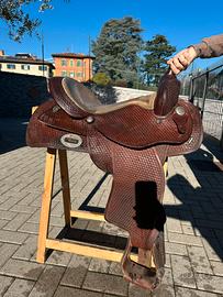 Vendo magnifica sella western originale Alamo Saddlery, rinomato marchio texano. La sella presenta una pregiata lavorazione "basketweave" (motivo a cestino) su tutto il seggio e sui quartieri, che le conferisce un aspetto classico e robusto.