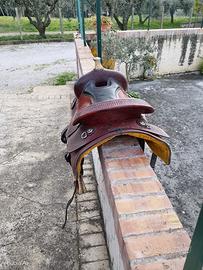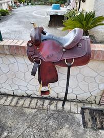 Vendesi sella americana in ottime condizioni usata pochissime volte come lo si può notare dalle foto. Arcione Quarter Horse Bars (apertura camera/gullet 6.75" / 17 cm) Seggio da 16". Vendo per inutilizzo.