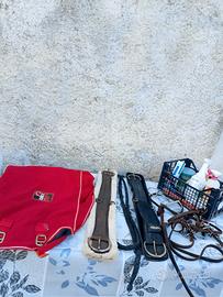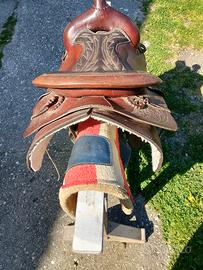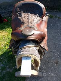 Vendo sella americana e regalo a chi prende la sella tutti gli accessori nelle foto,alcune cose sono da pulire altre leggermente rovinate . Ci sono due sottopancia,sotto sella a stelle e strisce,coperta per cavalli rossa,redini di cuoio,lunghina, cavalletto e accessori per la pulizia .. Tutto visionabile a Marostica in provincia di Vicenza. Prezzo 350 euro,ma ci possiamo accordare.