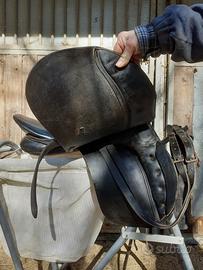 Sella da dressage nera in cuoio di qualità, misura 18", completa di sottopancia in cuoio, staffe (Prestige), staffili. È datata ma di ottima fattura e in buone condizioni. Ideale per chi pratica lavoro in piano e non desidera spendere cifre impegnative, o anche per non rischiare di rovinare una sella di pregio nelle prime fasi della doma o rieducazione cavalli. Euro 270. Vendo anche carrello portasella Euro 60 (vedi annuncio dedicato). Solo consegna a mano. NON SPEDISCO.