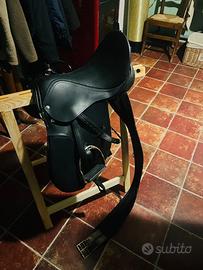 Sella da dressage/ completo nera, misura 16”. Venduta completa di staffe, sottopancia e coprisella. Consevata bene.