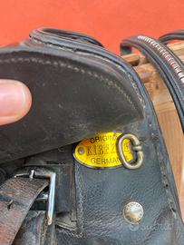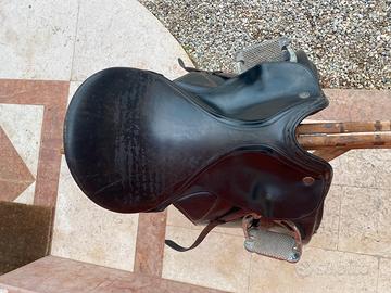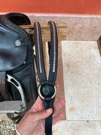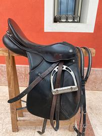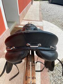 Vendo sella da dressage kieffer, completa di staffe e staffili, con pettorale equestro. La sella è usata, ma in buone condozioni. Presenta qualche normale segno di usura. Arcione perfetto. Veste molto bene cavalli rotondi con garrese non troppo pronunciato. Ho fatto mettere tre ganci sul retro della paletta utili per fissare bisacce o sottocoda in passeggiata. Vendo anche pettorale equestro. Volendo ho doversi sottosella non compresi. Prezzo leggermente trattabile. Preferirei consegnare a mano e non spedire. Per informazioni contattatemi senza impegno.
