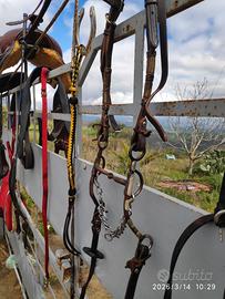 Vendo e soltanto in blocco la seguente attrezzatura: 1 sella super leggera "GARLAND" seduta 16; 2 sottosella; 1 sottopancia. 6 morsi tra americani e spagnolo; 3 testiere; 1 sottosella? 1 pettorale; 1 martingala; 1 bisacce; 2 frustini. inoltre, a chi acquista regalo: quattro scarpe cavallo Bosana e stivali usati da equitazione. il prezzo richiesto per tutto è di €. 500,00. Rispondo a Informazioni soltanto in privato. Il tutto è visibile in provincia di Enna. Eventuale richiesta di spedizione a carico dell'acquirente.