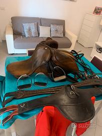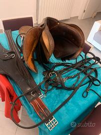 Sella inglese completa con tutti i finimenti 2 sottopancia una testiera completa 4 staffe una pettorina .. piu sottosella agnellino e coperta , vendo per cessata attività.. c è solo da darke una leggera ingrassata .. 3339061081 ULTIMO PREZZO .. regalo