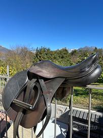 Sella inglese usata da salto, seggio piccolo, ideale per bambino, staffe e staffili fouganza.