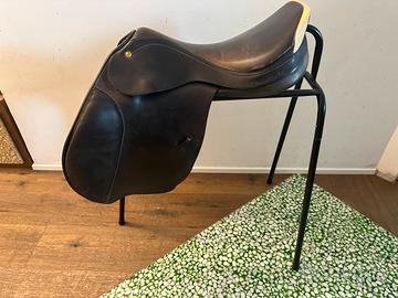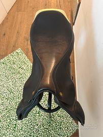 Sella Inglese, comprensiva di staffe e staffili, oltre a cavalletto. Regalo sottosella e coperta in cotone leggera per cavallo, blu con bordo righe gialle