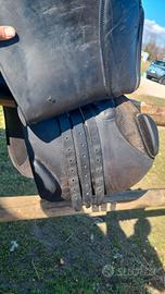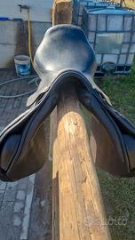 Sella inglese da salto nera, prodotta in Francia da Sellerie Forestier, misura 17 in buone condizioni, senza crepe e graffi, cuoio di ottima qualità