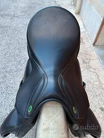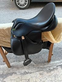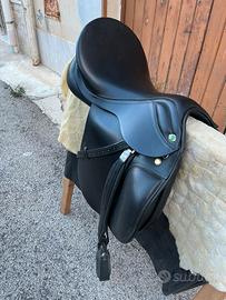 Sella inglese in pelle nera Prestige completa di staffe e staffilie martingala