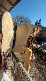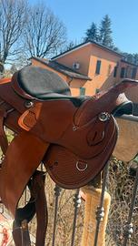 Vendo sella praticamente nuova, usata due volte misura seggio 16 pollici . Causa vendita :troppa grande per il doppio pony di mia figlia e per passaggio a monta inglese Misura quarter Materiale :pelle