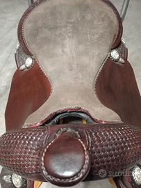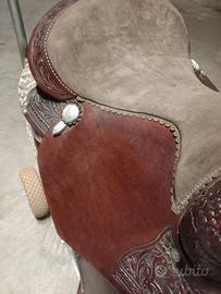 Sella reining lavorazione flowers con inserti in argento, nuova arcione fq, mis 16", vendo con sotto sella in lana e custodia come in foto, regalo carrello porta sella in acciaio.