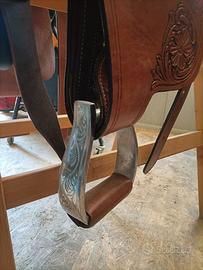 🟤 VENDO Sella Western Silver Horse Bob's Style 16" (40cm) – Come Nuova, in cuoio liscio con lavorazioni floreali sia sui fender che sulla gonna. Seggio in cuoio camosciato. Staffe in alluminio con pedana ricoperta in cuoio. Usata solo una volta per prova, condizioni impeccabili. 👉 Inclusi: sottopancia in corda + sottopancia posteriore in cuoio. ✅ Perfetta per chi cerca una sella solida, elegante e durevole nel tempo. Vendo solo perché purtroppo non adatta al mio cavallo.
