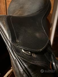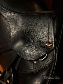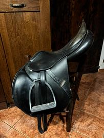 Sella Supreme Villa da salto, misura 16.5, in cuoio nero, completa di staffili e staffe, con alcuni segni di usura