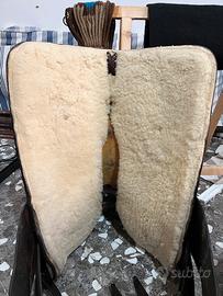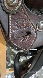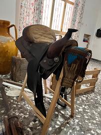 Vendo sella americana con agnello appena rifatto per cambio con sella all’inglese. Taglia 16 Possibilità di aggiungere anche il sottopancia western mohair (nuovo) con 50€ in più.