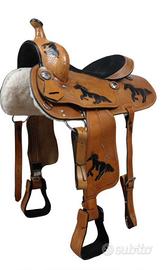 Vendo sella americana misura 15’ adatta a bambini, in cuoio. Completa di pettorale e sottopancia.