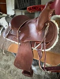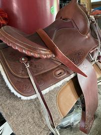 La sella è nuovo. Non si va sul mio cavallo. Sella western Prime, cuoio ingrassato, lavorazione flower, seggio in cuoio liscio, completa di sottopancia, misura 15.5‘ Marca Lakota