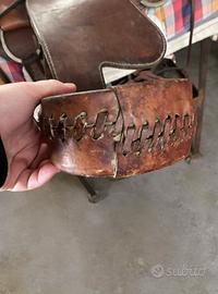 Vendo sella western in vero cuoio, struttura solida e ben conservata, ideale per monta americana, passeggiate e lavoro in campo. La sella è completa e presenta: Cuoio spesso e resistente Imbottitura inferiore in lana naturale Anelli in metallo robusti Completa di lacci e accessori visibili in foto Sottosella a quadri incluso Condizioni buone, normale usura da utilizzo ma perfettamente funzionale e pronta all’uso. Ideale sia per chi inizia sia per chi cerca una sella western robusta senza spendere cifre elevate. Disponibile per visione. Possibile ritiro a mano o spedizione. Per informazioni scrivere in privato. misura 15.5 "