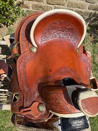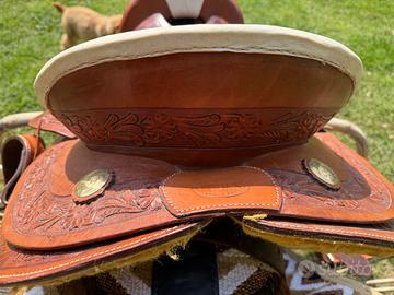 Sella western Pool’s 17.5 completa – ottimo stato Descrizione: Vendo sella western Pool’s originale modello 333, misura 17.5. Sella in ottime condizioni, pelle ben tenuta e lavorazioni incise eleganti. Lana sotto integra. Arcione medio-largo, adatta a Quarter Horse e cavalli robusti. Inclusi: •sottosella western •coprisella in montone Ideale per passeggiate, lavoro e ranch. Prezzo: 1.300€ trattabili Possibilità di prova per chi abita nel Lazio