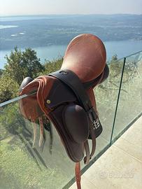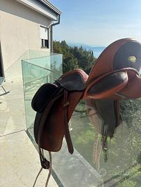 sella bicolore, praticamente nuova, usata solo due/tre volte. in vendita per cambio di disciplina. misura 17.5. completa di coprisella Zaldi e sottopancia corto in cuoio marrone Wembley con doppio elastico Waldhausen misura 75, usato una sola volta.