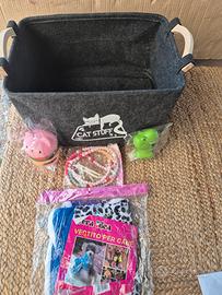 il kit conprende contenitore porta giochi piu 2 pupazetti piu un vestitino per cagnolino