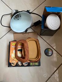 vendo set per terrario rettili/anfibi.tutti gli articoli sono praticamente nuovi e mai usati (come si vede dalle foto) vendo: 1 portalampada in ceramica con plaffoniera riflettente (immagazzina la luce e riflette di notte simulando luce lunare, ideale per rettili e anfibi) 2 lampada riscaldante in ceramica ed emettitore infrarossi, perfetta perché a differenza di quelle con la lice può essere accesa anche di notte e sostituire completamente altri sistemi di riscaldamento (tappetini, fili...) 3 ciotola mangime con coperchio per evitare che gli insetti come le tarme della farina escano dalla ciotola, il coperchio è removibile così da poter essere utilizzata anche come ciotola per l'acqua oppure per mettere frutta/verdura se avete animali che mangiano quello. il piccolo termometro che vedete non è piu disponibile. si vende sia tutto insieme sia singolarmente, il prezzo che vedete nell'annuncio è se comprate tutto assieme, singolarmente i prezzi sono : 1 portalampada 17€ (pagato 37) 2lampadina 11 € (pagata 27) 3ciotola 8€ (pagata 15) SOLO RITIRO A MANO, se interessati contattate che ci organizziamo (ritiro facile in zone sia caserta che napoli).