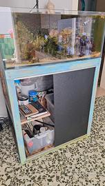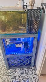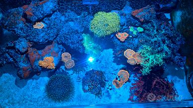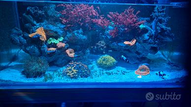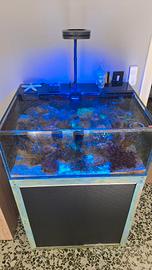 Shalow reef di 70 litri dismetto lo vendo completo di vivo plafoniera prime Hd Reef schiumatoio sicce 150 nel vano posteriore ci sono i mattoncini e la calza filtrante skimmer rabbocco e pompa di risalita animali ci sono 2 pagliacci Picasso lumache paguri ci sono anche delle alghe che aiutano alla stabilitá dell ecosistema rocce vive 10 kg piu dei coralli un anemone gigantea e sabbia viva