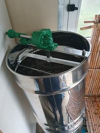 acciaio inox. si usa tramite manovella ma con un utensile costruito da me ci si può fare aiutare da un trapano avvitatore. capienza due telai
