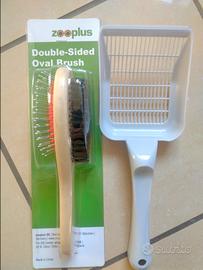 Spazzola doppia faccia per cani e gatti(un lato per districare e rimuovere il sottopelo morto, l'altro per lucidare e lisciare) + paletta per lettiera molto ampia. Nuovi