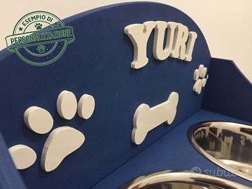Oggi voglio mostrarvi uno dei miei ultimi progetti: un porta ciotole personalizzato per cani, con due ciotole da 20 su un piano posto a 10 cm dal pavimento, colore blu e rilievi in bianco.