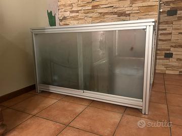 Copertura su due lati, lato corto copertura fissa, lato lungo con due ante scorrevoli in vetro satinato e telaietto in acciaio.