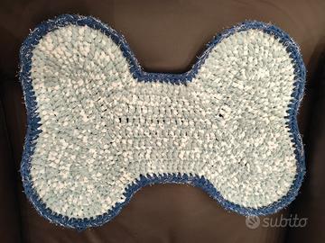 Tappetino sottociotola fatto a mano all’uncinetto, a forma di osso, nei delicati toni dell’azzurro con bordo blu.