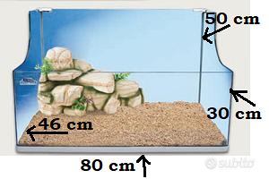 tartatughiera in vetro curvo 80x46x50 il lato più basso è alto 30 cm. Ottime condizioni usato pochissimo. Rimossa (ma compresa se richiesta) la finta pietra inesita all'interno come parte emersa. Questa finta pietra è stata rimossa perchè se usata come uscita da fabbrica, per quanto bella non permette di mantenere la tartarughiera pulita adeguatamente. Trasporto a carico dell'acquirente località Budrio(BO)