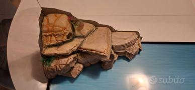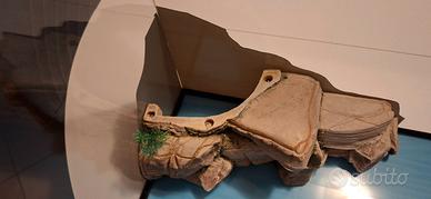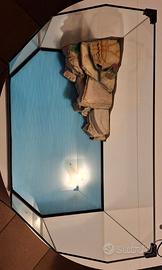 Bellissima tartarughiera in vetro a fondo esagonale con isola in resina, accessoriata per la circolazione dell'acqua nel filtro e per la regolazione della temperatura.