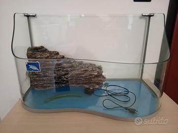 Tartarughiera funzionante in vetro con motore. Lunghezza 80 cm., altezza 48 cm., profondità 45 cm., peso più di 15kg Ritiro a casa del venditore a vs. carico. Come segnato nella condizione, la base è leggermente macchiata.