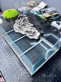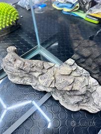 Base in plastica, nel complesso è messa molto bene a parte i normalissimi segni di usura, unica “pecca” è una scheggiatura sul lato sinistro (vedi 3a foto sul bordo alto della parete di sinistra) posso mandare foto piu dettagliata, per il resto noente crepe e silicone messo ancora molto bene, la roccia interna è mobile in maiera da pulire per bene l’interno e ospita un foro per nascondere un tubo di un filtro o una cascata (nata per ospitare una cascata)