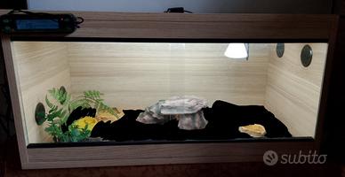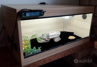 Vendo INSIEME geco e teca in legno pagata sui 500€. In buonissime condizioni, unica cosa è che non sappiamo bene come funzioni il dispositivo per il controllo della temperatura e la lampadina riscaldante, andava perfettamente, poi si è resettata e non siamo più riusciti a mettere le impostazioni sistemate dal venditore (esperto nel settore), quindi non sappiamo se funzioni ancora bene (in poche parole, bisogna farlo controllare e in caso riprogrammare, perché dalle istruzioni noi non ci siamo riusciti). Vengono inclusi anche alcuni oggetti comprati insieme alla teca (presenti in foto). VENDITA DI PERSONA. mi trovo a Brescia più o meno vicino al centro. In alcune foto c’era la fibra di cocco (ecco perché ho cancellato la base), però ho caricato una foto dove si vede per bene la teca senza il terriccio. CONTATTATECI IL PRIMA POSSIBILE(SCRIVETECI E NON ACQUISTATELO SUBITO, VENDITA SOLO DI PERSONA, chiamate uno di questi numeri: +39 327 396 4607 oppure +39 371 534 6337). Misura 40x80 cm (mi è stato detto che era la misura adatta per contenere due gechi).