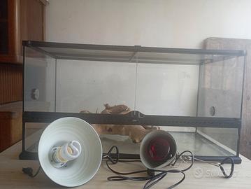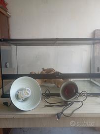 La vendo compresa di accessori che si vedono in foto: un tronco, una lampada infrarossi e una lampada UVB da montare esterna alla teca (sopra dove c'è il coperchio a zanzariera).