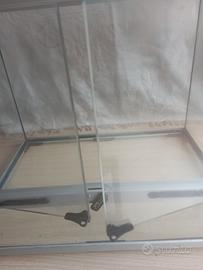 Vendo teca per rettili in vetro con apertura frontale, misura 60x45x45 in buono stato (una delle 3 clip che chiude il coperchio sopra è rotta).